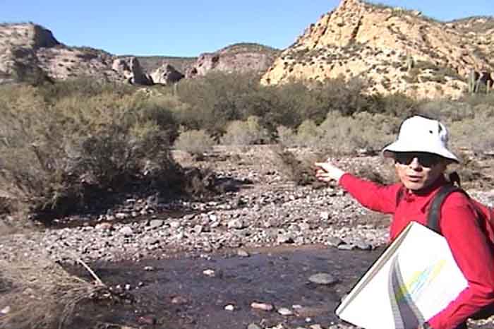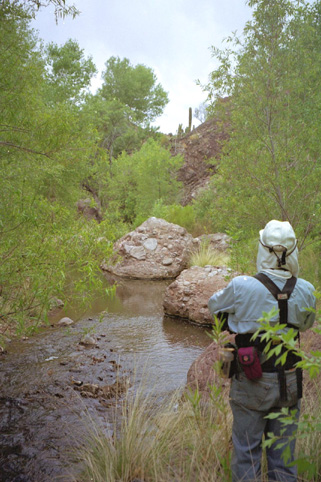 The straightaway side-wash running into the main wash from the NW at this point marks that line of this fault, downward movement along which (occurring less than 20 MYa) has juxtaposed the younger (and formerly higher) San Manuel Formation beside some of the older Galiuro Volcanics, of which theYellow Cliffs and their counterparts across the canyon to the east are a part. Below left, the Yellow Cliffs stand on the left (and less conspicuously, on the right) beside the Hot Springs Canyon stream. Below right, geologist Mick Meader points northwestwardup the Teran Wash Fault, with the Yellow Cliffs on the right and the San Manuel Formation on the left.