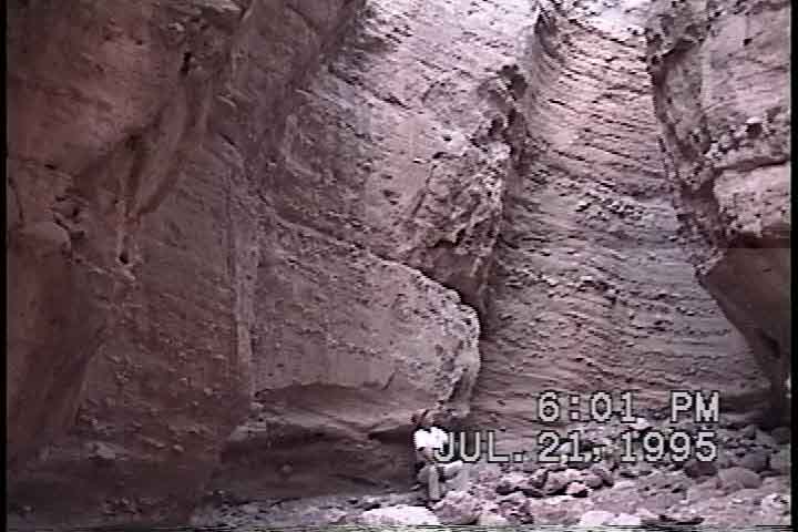 This sharper tilting of the entire formation reflects the mountain-formation fault-block processes that occurred in the Galiuro region mostly after these San Manuel rocks were laid down. Though mainly sedimentary, the San Manuel formation includes some air-fall volcanic ash in places, and dates to lower Miocene times (from 22 to no later than 15 million years ago, when the major block-faulting began). Our whitish "cleft" near the yellow cliffs, and our "meditation" place across the wash from Rabbit Ears, display the quality of this remarkable formation very strikingly, including its tendency to produce very deep, narrow clefts during very rapid erosion.