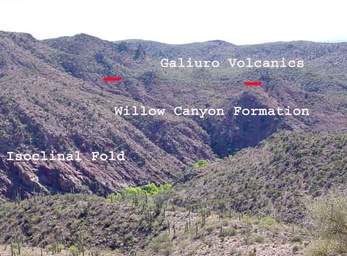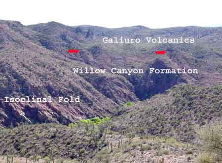The Isoclinal Fold (one in which the compressional stresses that caused the folding were so intense that the fold closed, so its limbs lie parallel to each other) lies along the Canyon flank further upstream. We captured a good view of it in this aerial photograph taken in February 2003, below left, while the diagram below right (provided by Robert Scarborough and Mick Meader in their geology walk of November 2002) shows how the thrusting from right to left caused the fold as the older Willow Canyon Formation was pushed (during the Laramide Orogeny) over and above the younger Cascabel Formation, visible as the gray formation at lower left in the right-hand diagram.