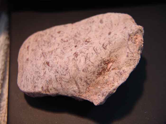 Both of these rocks are clasts derived by stream erosion during Willow Canyon Formation times, from even older sea-bottom formations. Their shapes are unusual -- lenticular in cross-section, almost discus-like. The fossils are tiny shells, which appear only in cross-section, looking like tiny fingernail clippings. Mick Meader indicates they are of Paleozoic age (Carboniferous to Permian times, some 350 to 250 MY ago), which formed in sea-bottom lime muds, which were then uplifted, broken down by erosion and eventually deposited into Willow Canyon sedimentary formations as these water-worn cobble remnants. The one on the right is very flat, about the size of a man's palm; the one on the left is somewhat smaller and relatively somewhat thicker. Below see an indication of the size of these shells in the left-hand rock: