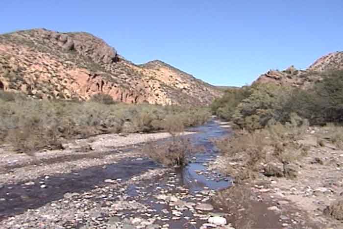Just upstream from the Soza Mesa Fault boundary between the Galiuro Volcanics and Willow Canyon formations, now walking in the canyon floor itself, we leave the Quaternary gravel/silt alluvium of the stream bed and walk upon the small Cretaceous Intrusion of diorite and andesite porphyry (identified above). This is younger than the Willow Canyon formation; Mick Meader suggests it may be a dike or conduit of one of the large stratovolcanos erupting during the Muleshoe Volcanics (which occurred about the time of the Cascabel Formation, see below), or possibly synchronous with the thrust-faulting period just discussed. (See also the cross-section map, B - B', in Hot Springs Canyon X-section). It runs along the canyon about 1/10 of a mile, then gives way to Willow Canyon Formation on the valley floor (and which also fills the canyon sides at this more upstream point).