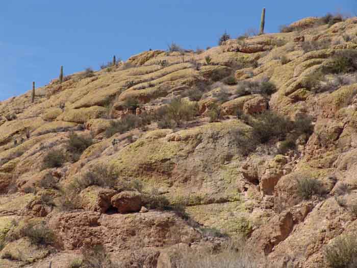 The Teran Wash Fault that marks this NW-SE-running side wash has some remarkable features, including (Below left) this apparently detached, massive, boulder-like San Manuel rock. Below right, the Yellow Cliffs are not really yellow insofar as their rocks are concerned -- the "Yellow" is produced by the kind of lichens growing on south-facing sides.