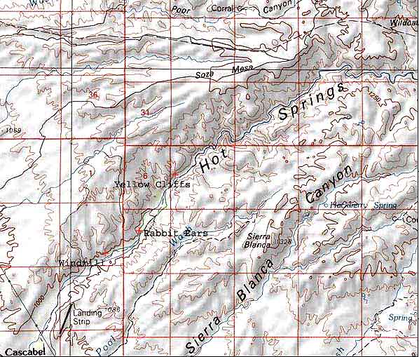 Below, a photograph of Henderson Cliffs on the right bank of lower Hot Springs Canyon in February 2008. This Quiburis outcrop is a southwestern distall tip of one of Soza Mesa's many outstretching fingers.