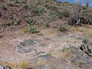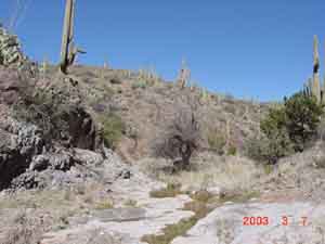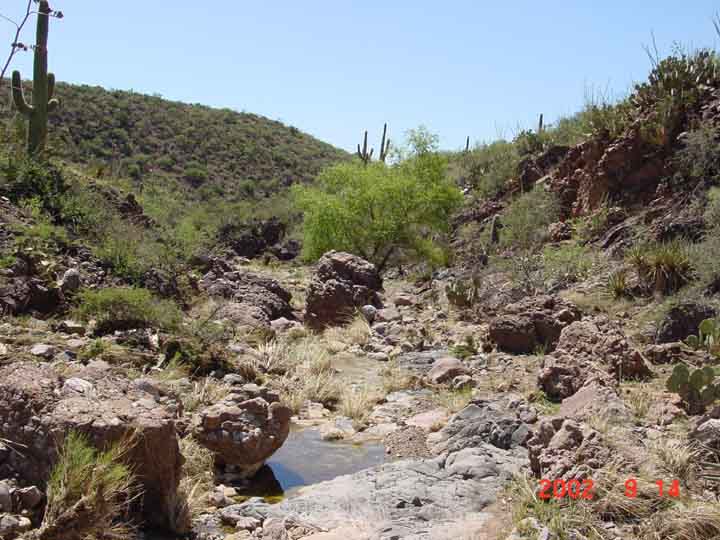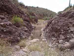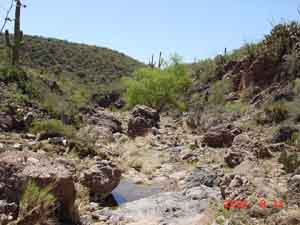 Proceeding upstream, the dark rosy-brown Cascabel Conglomerate so often seen in this Wash re-appears, prominently at photostation 05-a, shown below left, where a large monolith has been formed by a small side-wash running down from the northwest, dividing its stream at the confluence. Below right, viewing the monolith from the downstream side, you get a good view of this fairly typical combination. (Click on each image to enlarge it.)