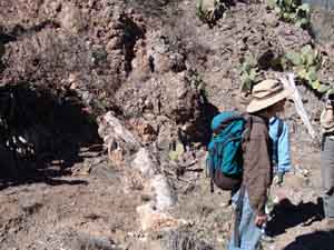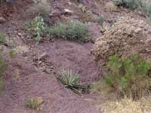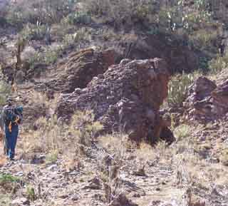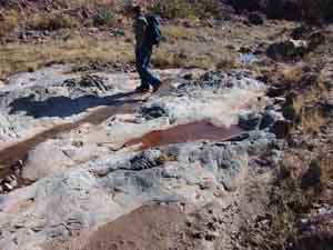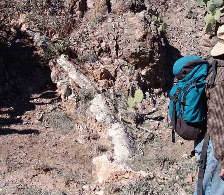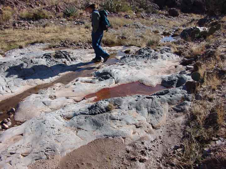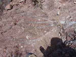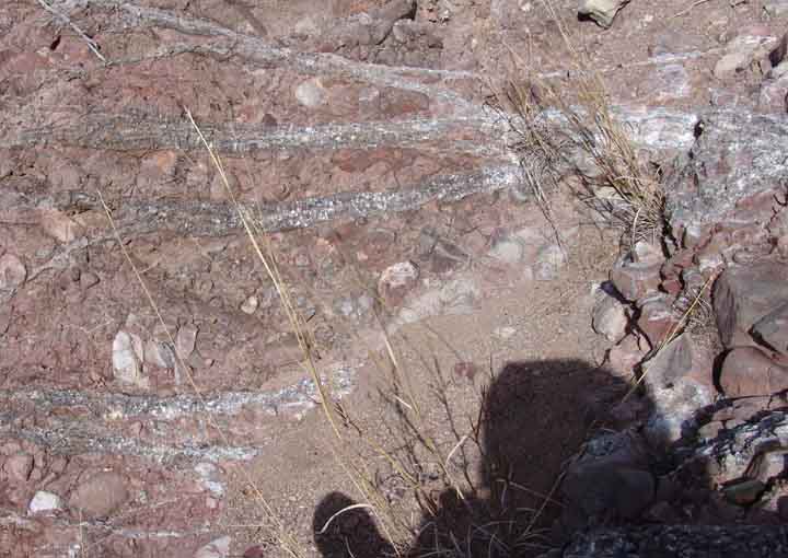 Below left, a large vein of calcite-rich (?) rock cuts through the conglomerate near photostation no. 02. Below right, calcite veins of various sizes are quite common crosscutting the bedrock as we approach the vicinity of Sierra Blanca Spring. (Click on each image to enlarge it.)