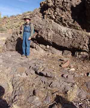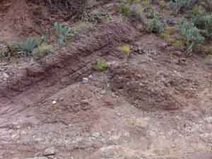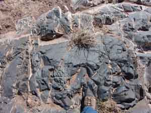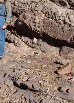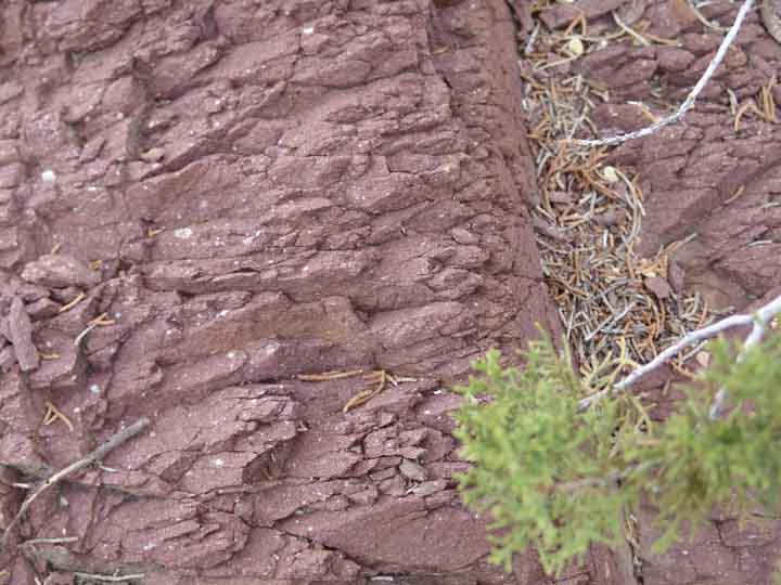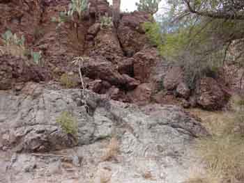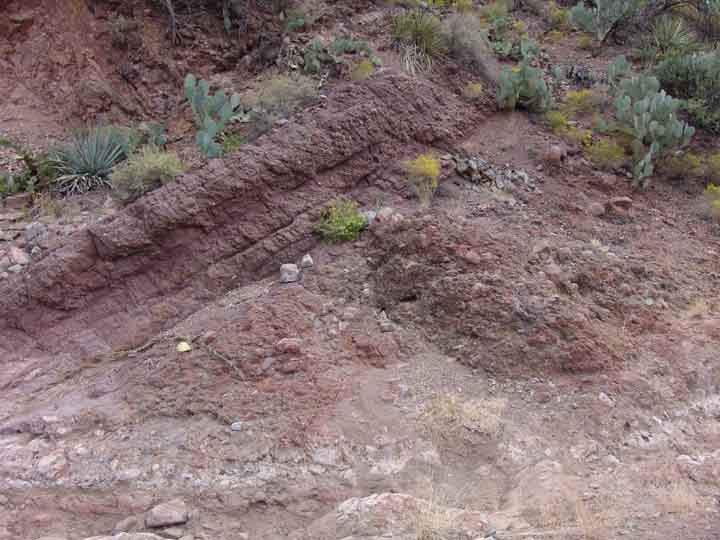 The image above right shows this bedrock in contact with the overlying material -- here is a closer view: (Click on each image to enlarge it.)