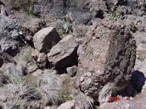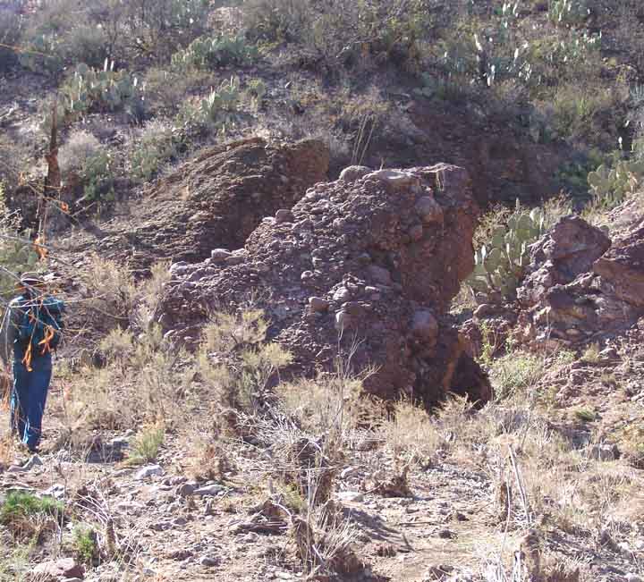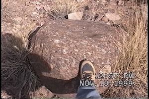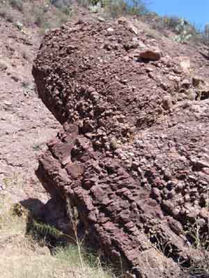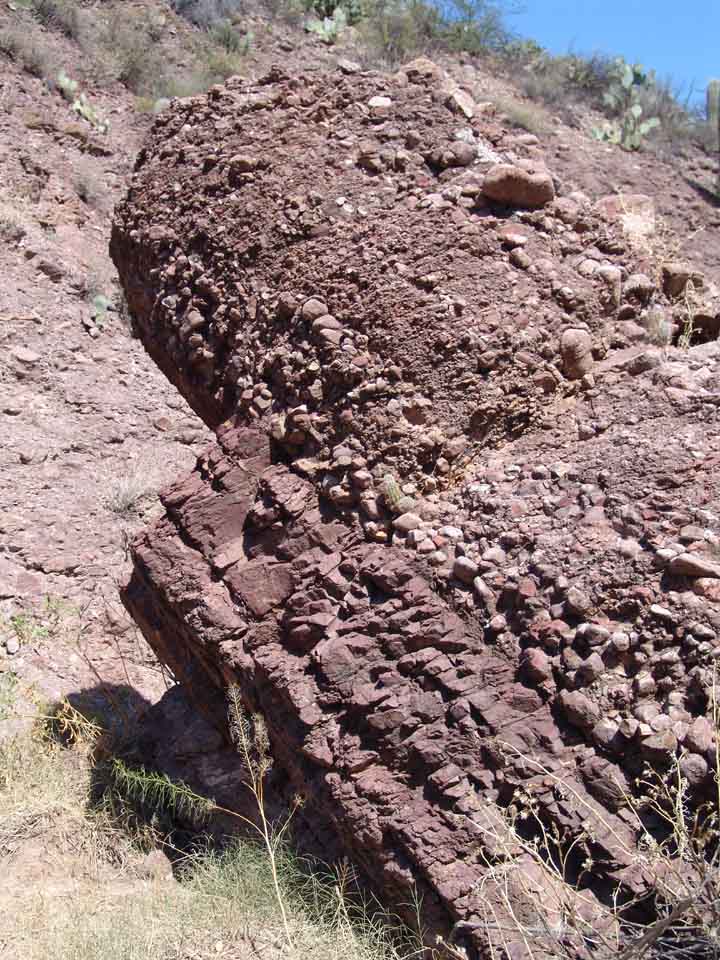 In a number of places along Sierra Blanca Wash, one encounters large boulders, strongly rounded by long subjection to substantial river-flows, which are themselves composed of conglomerates looking much like that found in the bedrock of our Cascabel Formation. For example, here is a very large river boulder eroded out into the Wash near Hackberry Spring: (Click on the image to enlarge it.)