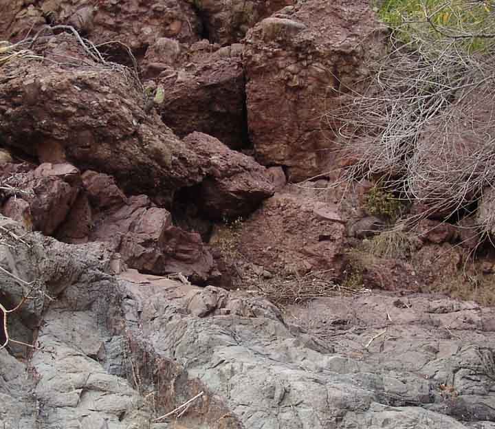 Below left, coarse cobble-to-boulder conglomerate of the Cascabel Formation at photostation no. 14, just upstream from the Hot Springs Thrust Fault. Below right, three contrasting layers of the characteristically dark rosy-brown Cascabel conglomerate at photostation no 12-a. (Click on each image to enlarge it.)