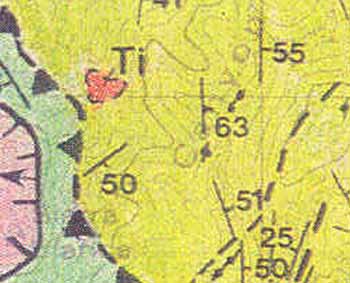 Geologist Mick Meader, looking at these photos, comments that this "looks like a volcanic flow (more basaltic in composition). I don't believe that it is sedimentary" [personal communication]. We looked more closely at the Goodlin-Mark map of the area, and indeed it indicates the presence of an intrusive formation at this point, shown below (marked as black dots connected by a black line) -- photostation no. 09 is located right at the "6" in the location labeled "63" on this map.