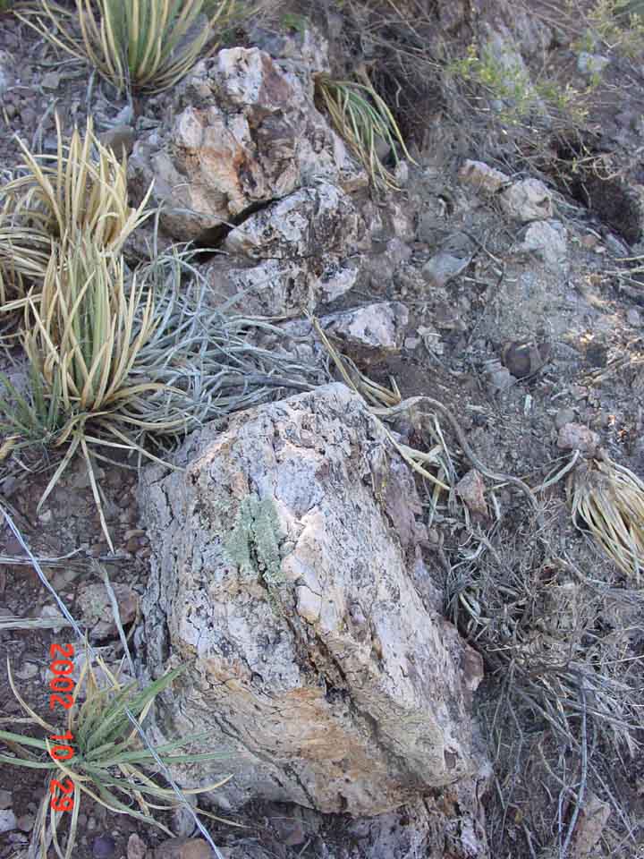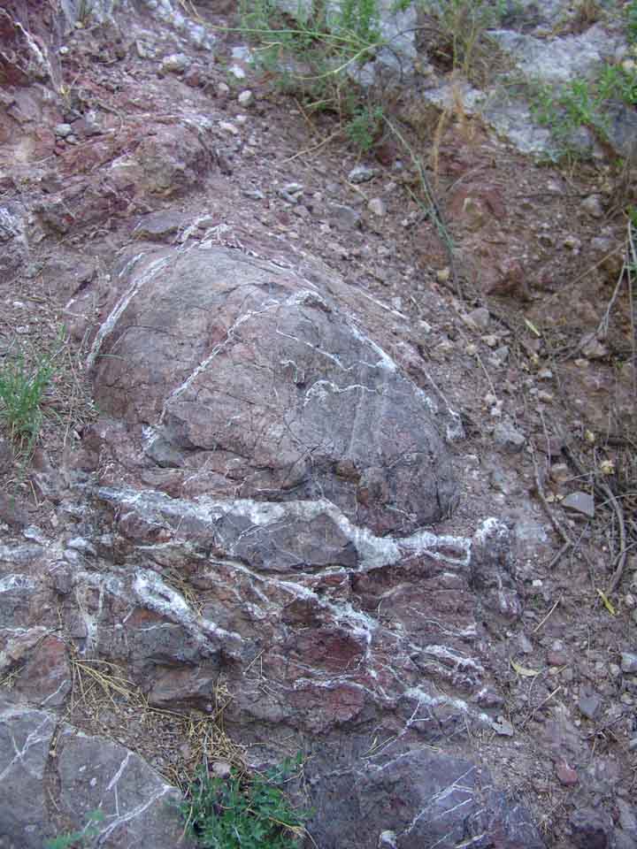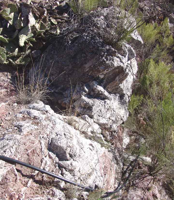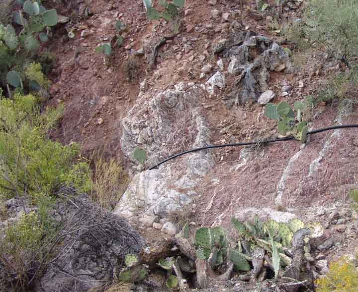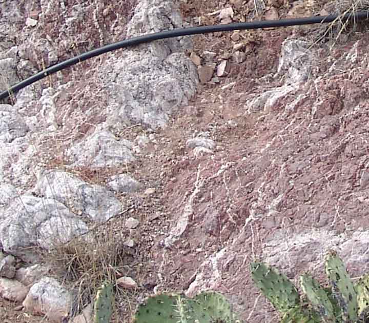 Veins of calcite crystals running through layers of Cascabel Formation conglomerate appear very frequently in this area. Just above the Spring in Sierra Blanca Spring Wash, one sees many such veins crosscutting and replacing the dark-reddish rock, as photographed below left, in July 2004. And in the hills far above the Spring one finds outcrops of almost vertically tilted, intensely carbonate-impregnated rocks of the Cascabel Formation, like the one at right, photographed during October of 2002. (Click on each image to enlarge it.)