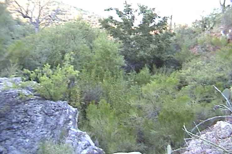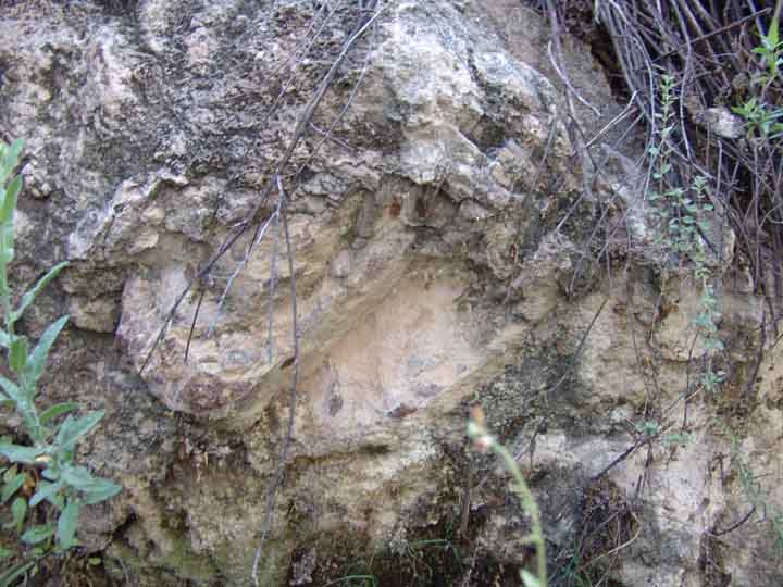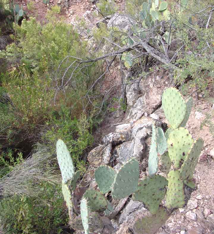 Above, a view of Sierra Blanca Spring from a point just above it, showing rocks of the Cascabel Formation that have been impregnated and more intensely lithified by the calcium carbonate associated with spring waters. Below, note how sharply these beds stand out in appearance from the CF rocks that lie below (and above) them: (Click on each image to enlarge it.)