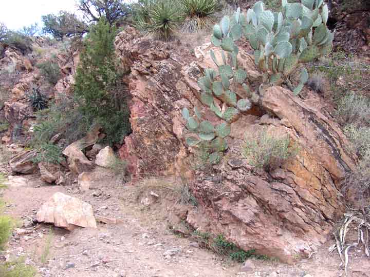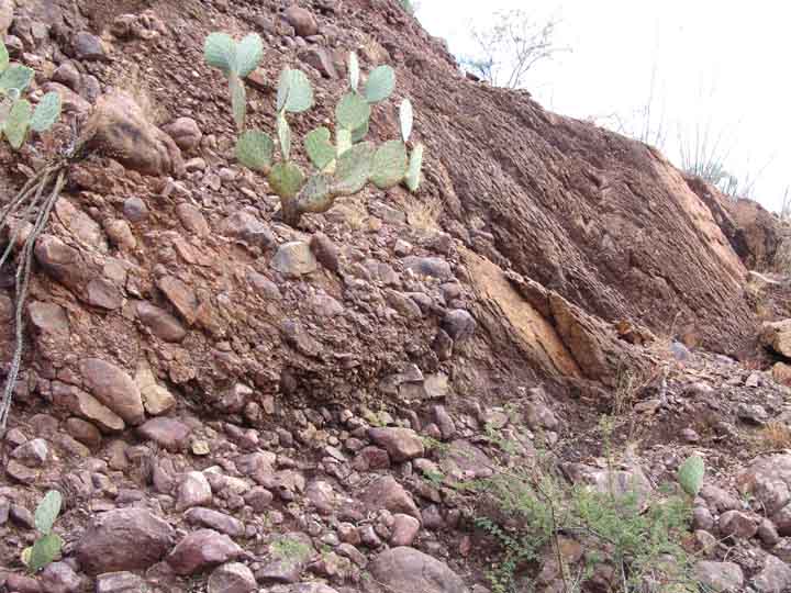 Below, two views of the Willow Canyon Formation along the east bank hillock just below the confluence. Note the sharp tilt of the Formation upwards toward the northeast, and how some of it attains colors from dark salmon to an almost orange color.(Click on each image to enlarge it.)