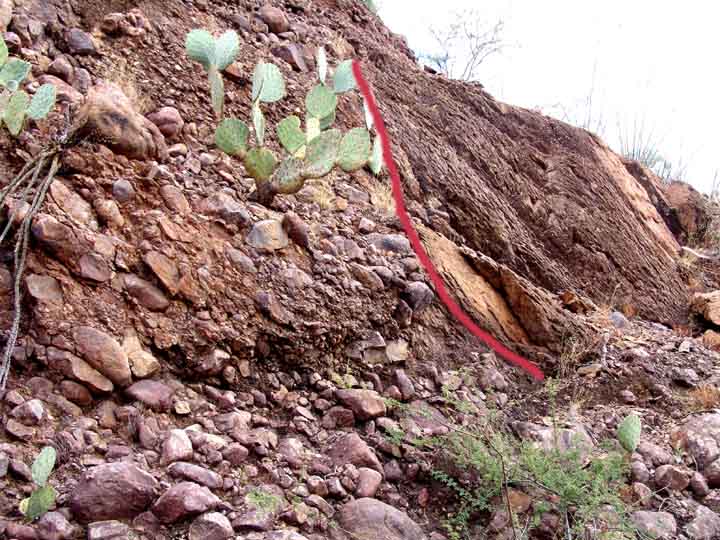 Below, a view of the interface from the other side of the wash. This gives a more vivid view of the collision, with the coarse CF conglomerate in the lower left half of the image, the WC finer, sharply tilting material at upper right. In the right-hand image, a red line marks roughly the point of the interface. (Click on each image to enlarge it.)