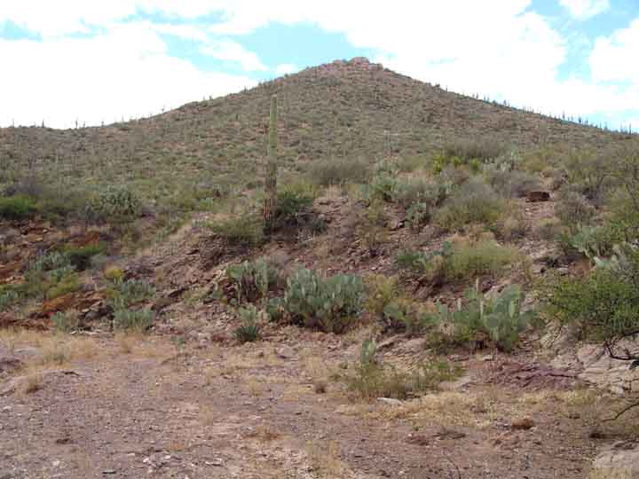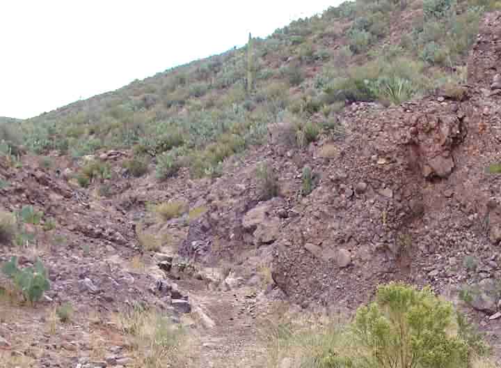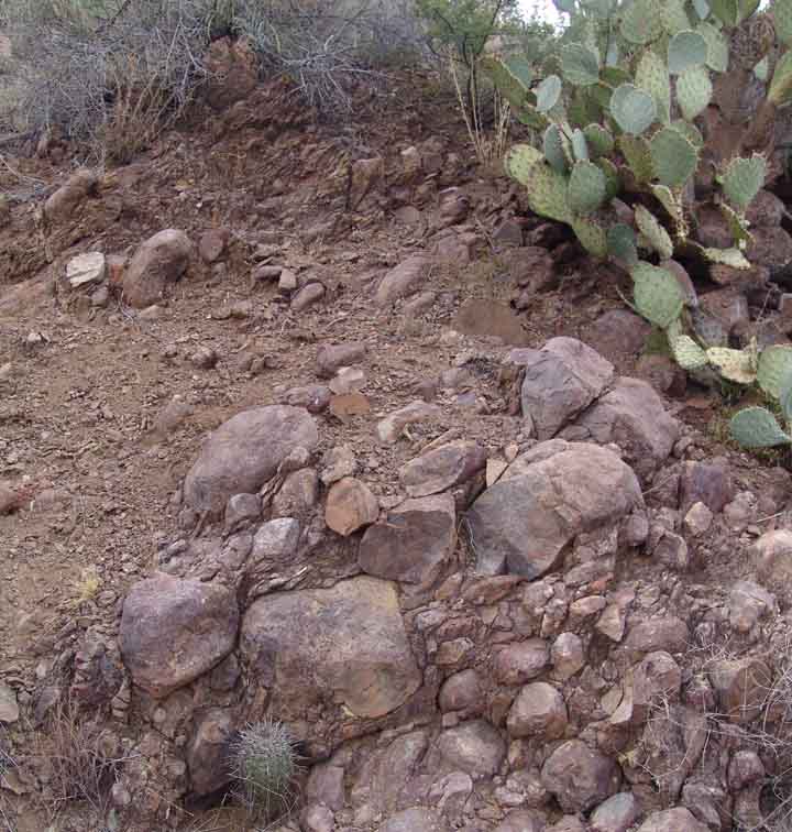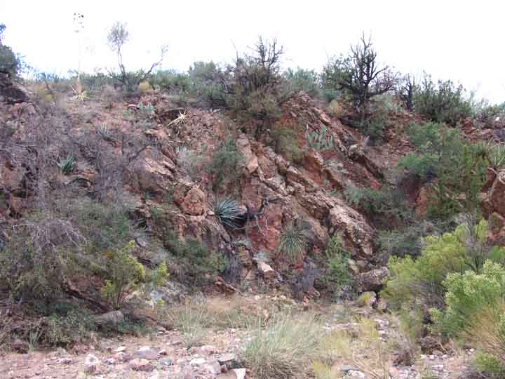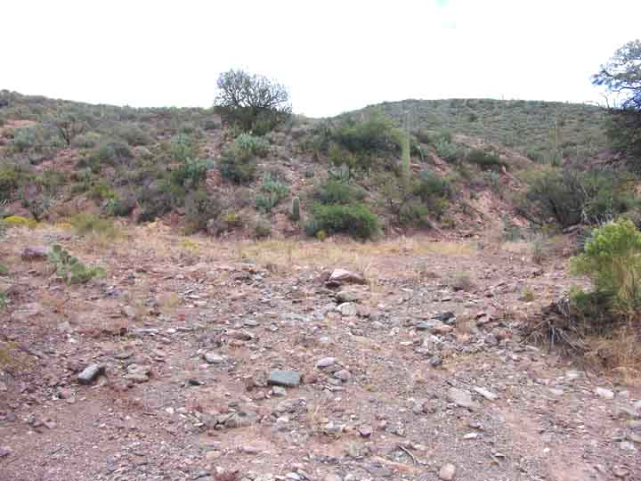 Below, a view directly upstream from this point, showing the dark rosy-brown Cascabel Formation conglomerate exposed along both flanks of the wash: (Click on each image to enlarge it.)