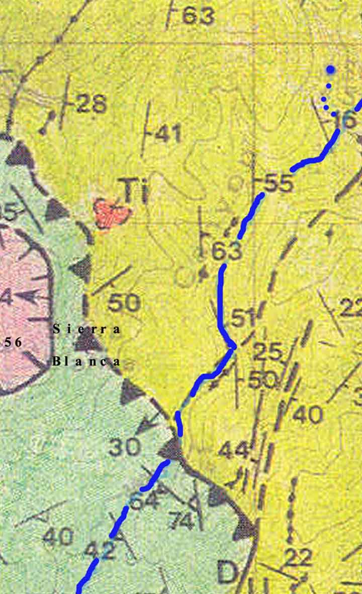 The Hot Springs Canyon Thrust Fault is shown in the map at left as a black saw-toothed line.