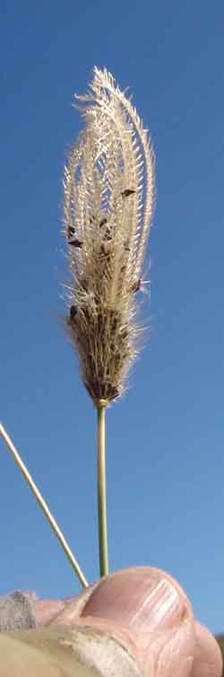 Feather Fingergrass is an annual plant, with a shallow root system, growing to over 3 feet high and reproducing by seeds.The flower (left) consists of from "2 to 10 tawny, narrowly featherlike soft flowering spikes, 3/4 to 3 1/2 inches long, arising together at the stem tips. Each spikelet has a tuf of
