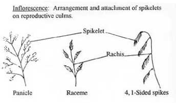 The flowers of grasses are individual, simple florets, lacking petals and grouped in "inflorescences" (varieties indicated at right). We will not use all these specialized terms, but the distinction between "panicle" and "spike" seems useful. These kinds of differences are obvious when viewing a field of plants.
