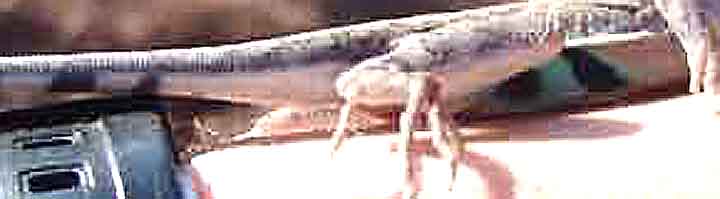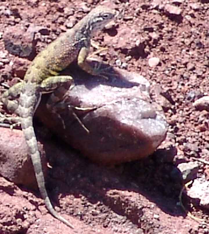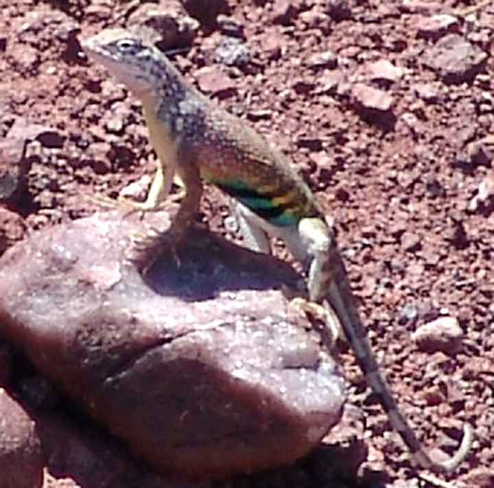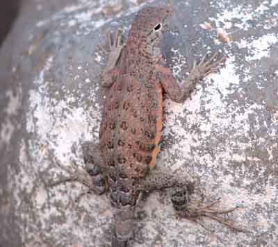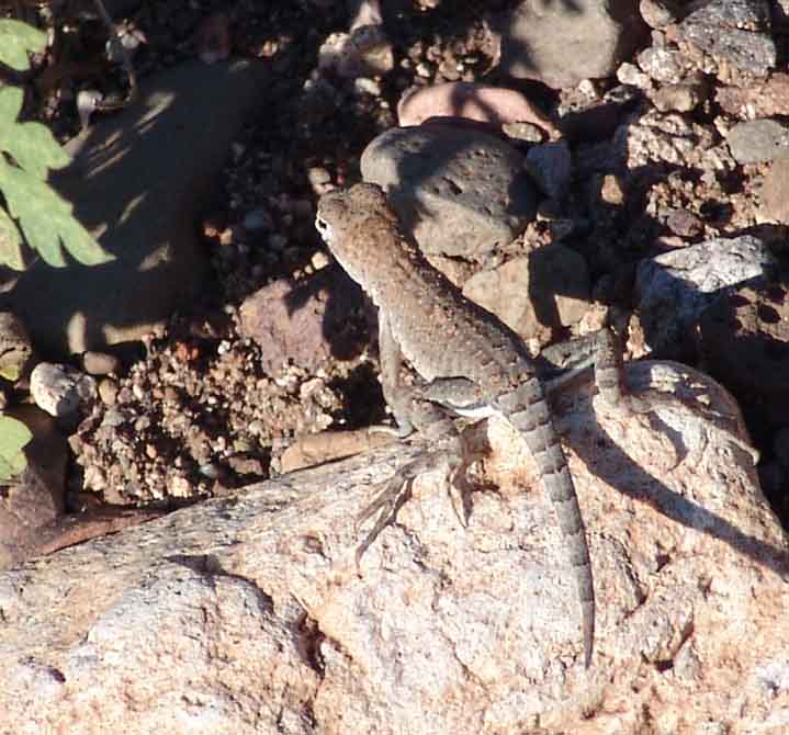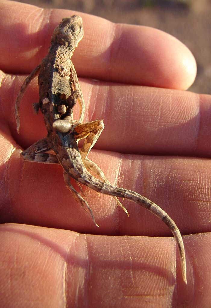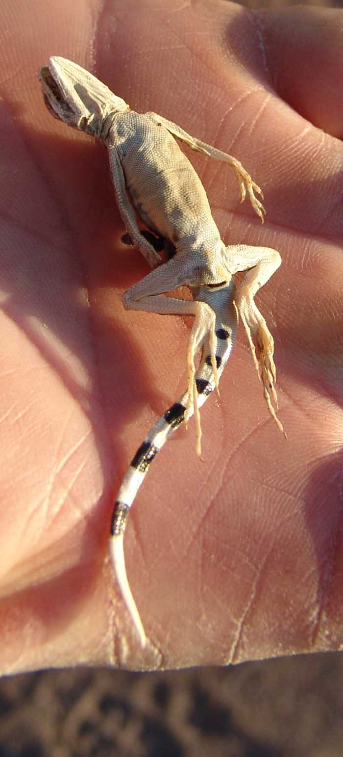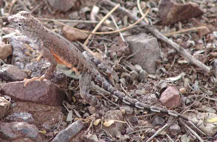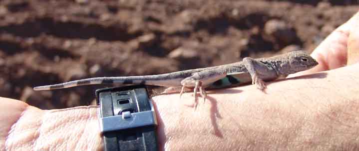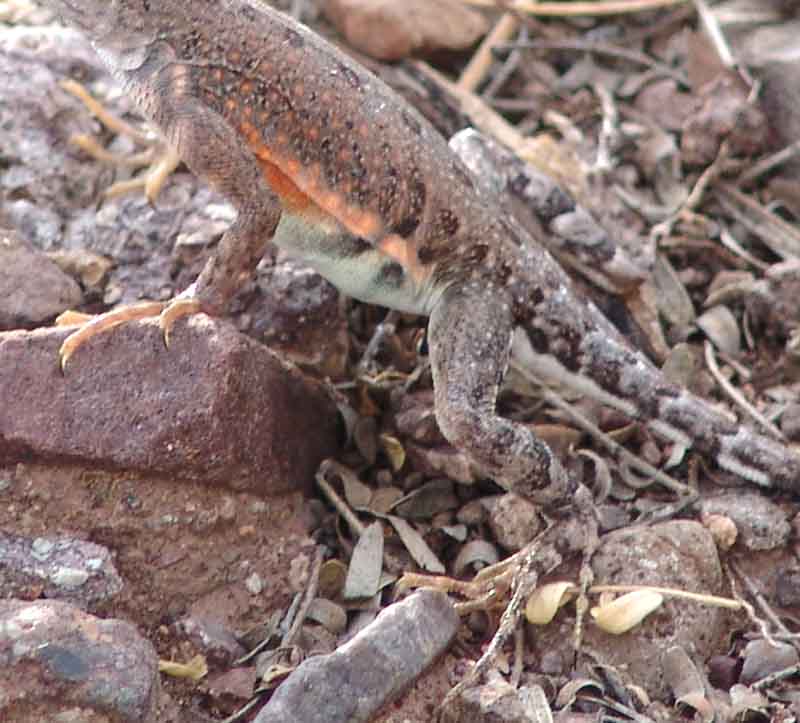 These lizards are similar to another lizard of our area, the Zebra-tailed Lizard, with which it should be compared. We think that the one shown just above cannot be a Zebra-tailed, because it lacks black bars on the dorsal portion of the tail. (We think, but can't see, that it has them on the ventral side.) Below, a young animal accidentally unearthed in May 2005, so it was still cold and had very limited energy, showing the characteristics just outlined (bars ventral, not dorsal), and also the characteristic belly colorations (Click on the image for detail closeup):