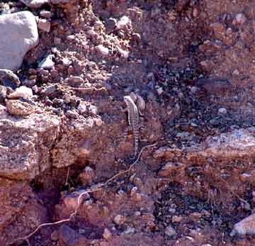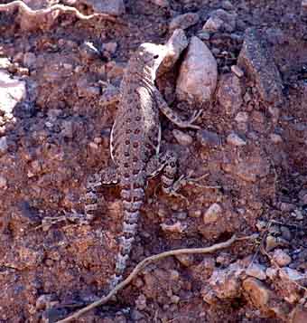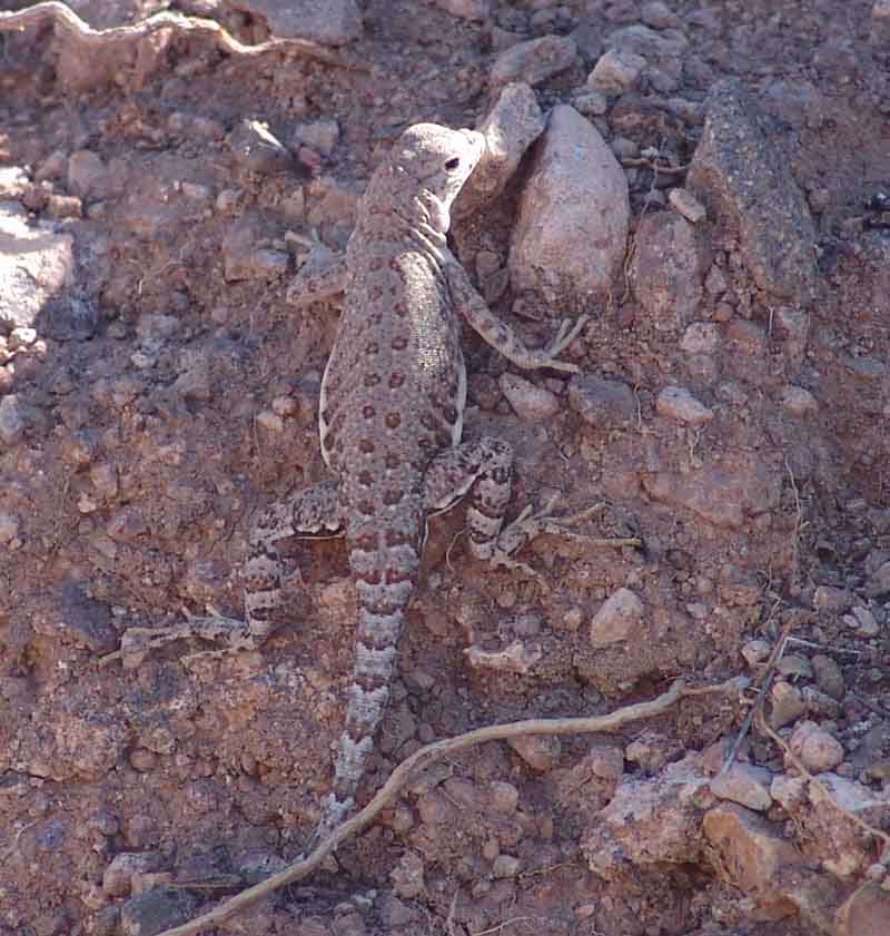 We think that this one, below, is also a Greater Earless. This, too, was seen in an open, sandy wash tributary to Hot Springs Canyon in August 2004, and it was poised to leap and run at any further movement. This zoomed image was as close as we could get.
