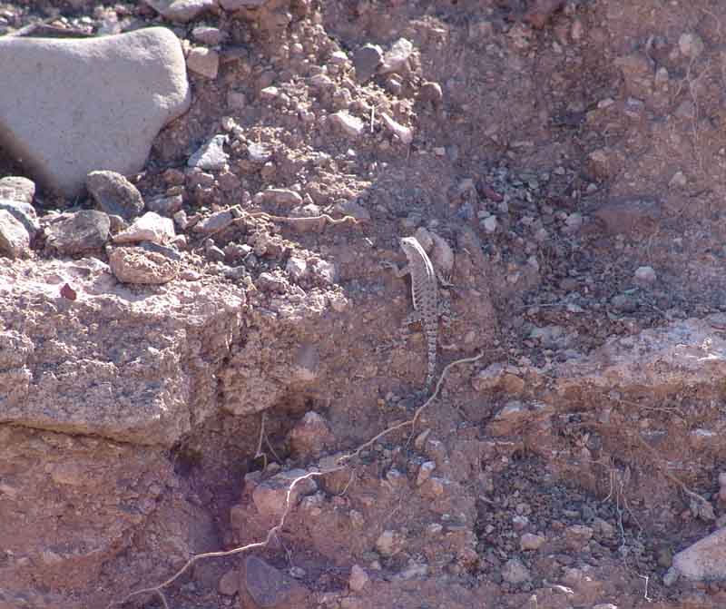 This lizard, below, we saw climbing a north-facing cliff along a lower Soza Mesa wash in October 2006. We were unable to see belly colors, but the overall back patterning is especially good. (Click on each image to enlarge it.)