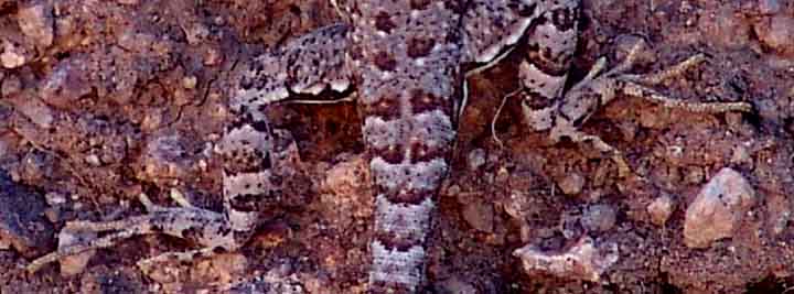 This lizard is a denizen of our own Arizona Uplands habitats, therein favoring "sandy, gravelly soil of flats, washes, and intermittent stream bottoms where plants are sparse and there are open areas for running." (Stebbins, cited above, p. 117) This is the habitat where we found the corpse above-- a silt flat of Lower Hot Springs Canyon -- and it is also a place whose general ground coloration matches the dorsal colors of this animal. When we picked the specimen up, a worm feeding on its innards proceeded to crawl out toward us (note the center of the dorsal view at left), so we quickly returned the body to its previous location so the larva could continue its feast.