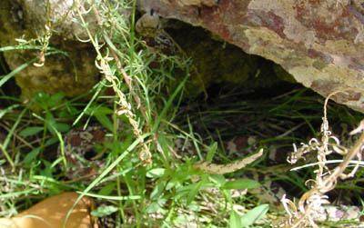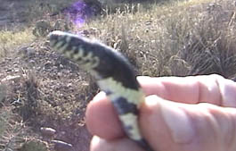 Below, we encountered a young snake -- about the thickness of a man's little finger --moving about in grasses near the Red Tank in Teran Wash, late September 1999: