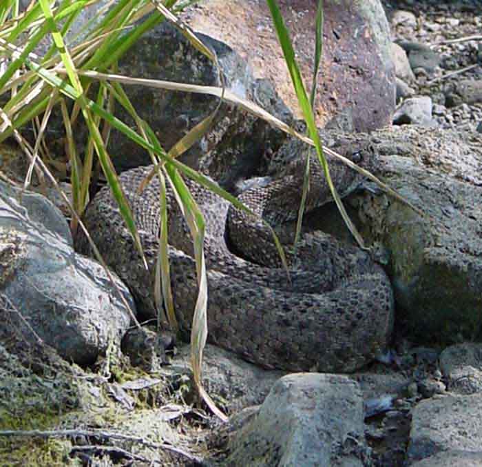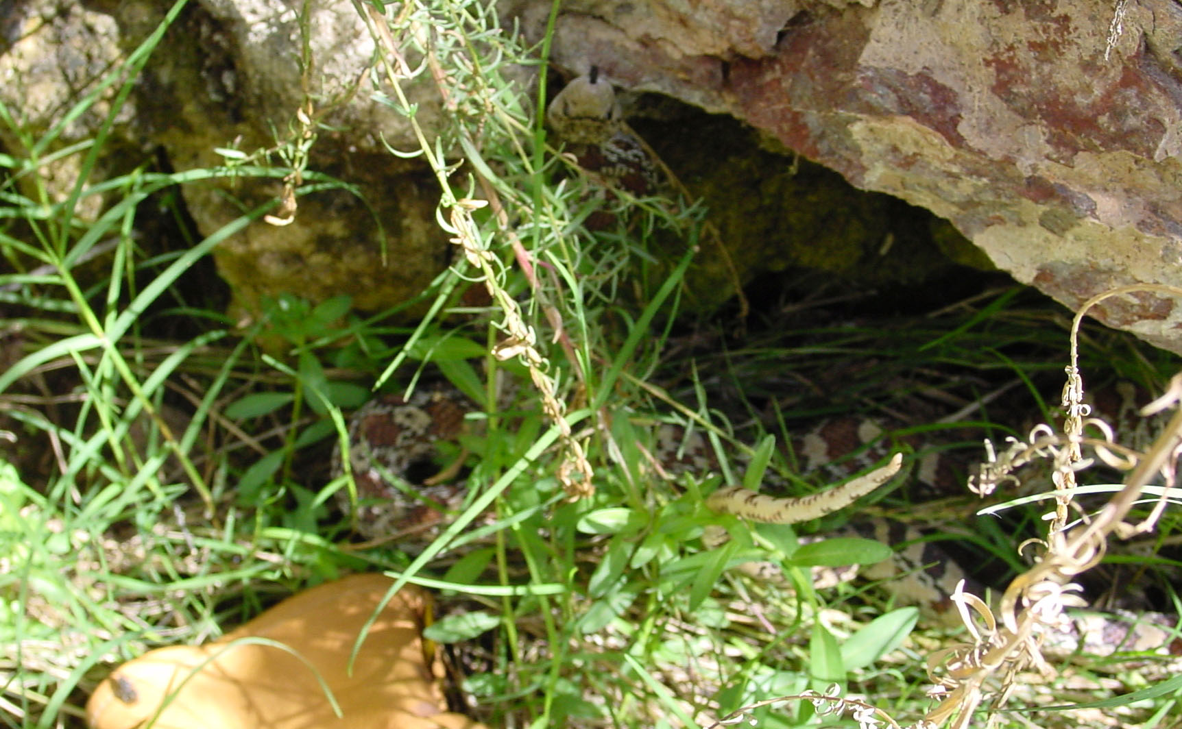 First, rattlesnakes can be readily distinguished from the other snakes of our area first of course by the presence of a tail rattle and second, by the presence of a large triangular head offset by a narrow neck. In the images immediately below, the distinctive head-neck pattern is not as well displayed as it might be.