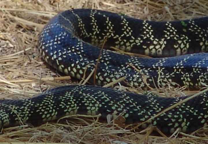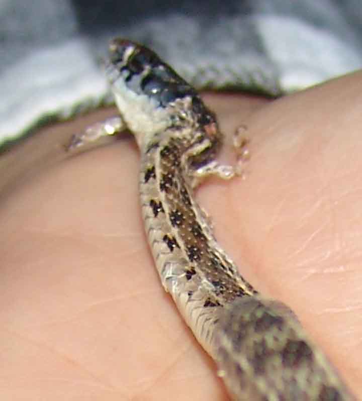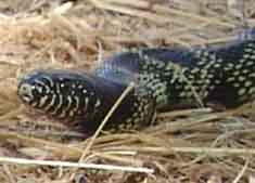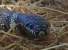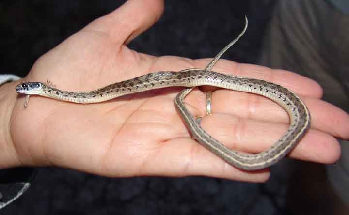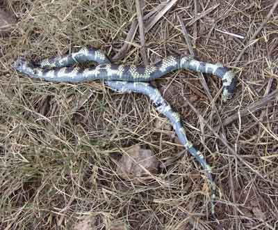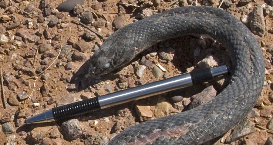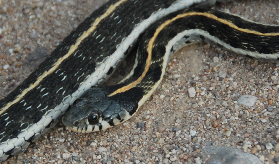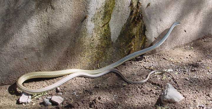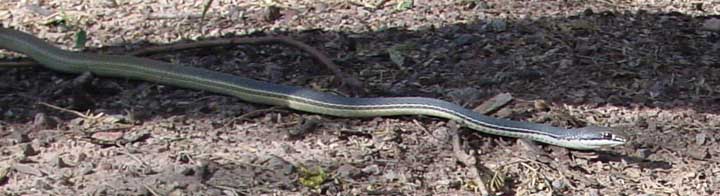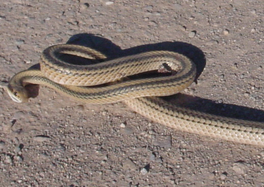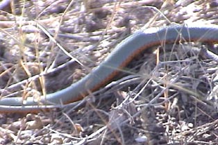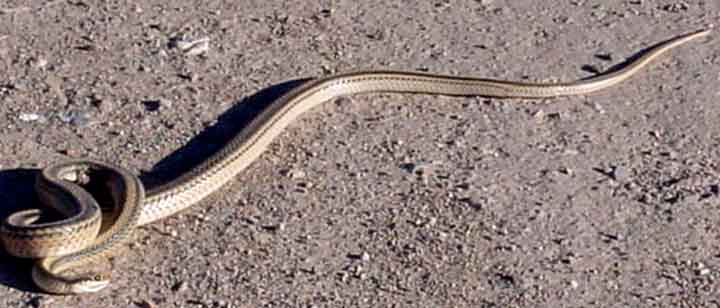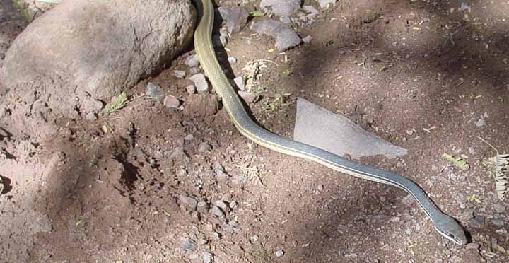 The snake below was encountered at the Hot Springs Canyon Windmill in August 2003. The first image shows the distinctive bluish gray color running from its head toward the middle, and two light-colored stripes on each side, which fade rapidly toward the tail.