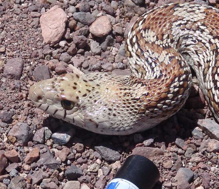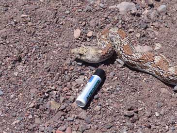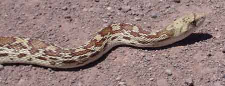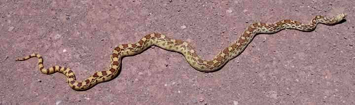 Gopher Snakes in our area are yellow or cream-colored, with black, brown, or reddish brown blotches on the dorsal side, usually more widely spaced toward the tail than on the body (quite noticeable here in the photo above) and -- in the Sonoran variety, they darken toward the rear (also evident here -- the contrast between light and dark coloring sharpens noticeably). This gopher, photographed along Cascabel Road in May 2004, is one of the longest we have ever seen in our area, probably more than seven feet long.