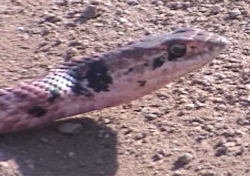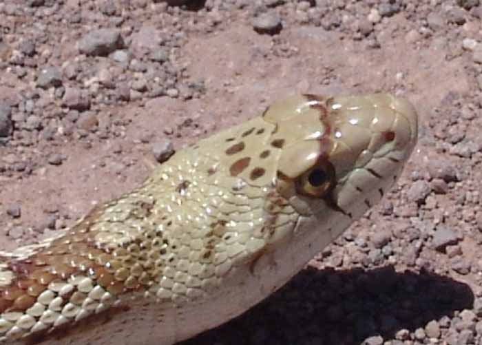 Usually there is a dark line across the head in front of the eyes and from behind the eye to the level of the jaw. This is clearly visible in the head photo below left (our very large snake shown above), but not so clear on the much younger snake seen in Teran Wash in April 2007, below right. Click on each of the two images below to enlarge it.