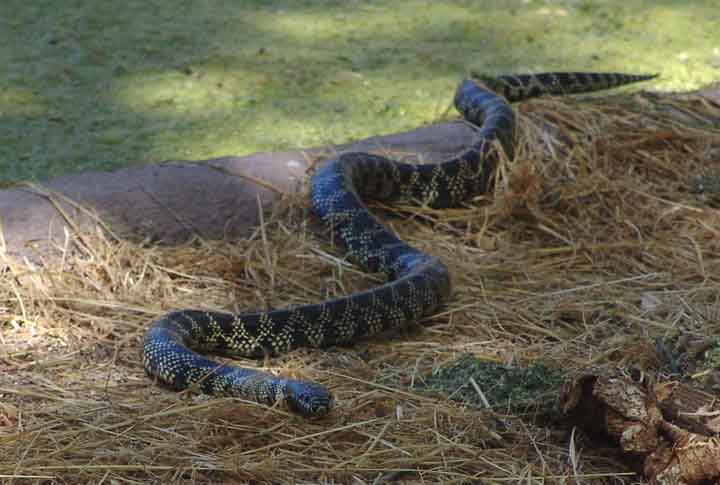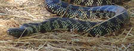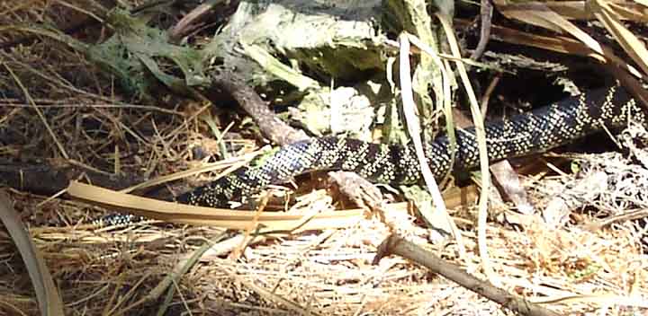 We saw a strikingly different color pattern in the Kingsnake in Lower Hot Springs Canyon Wash beside an artificial pool in May 2006, shown below: