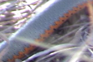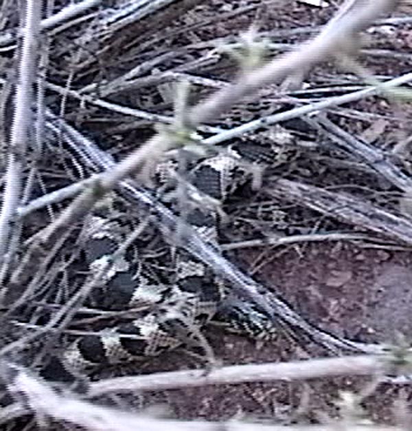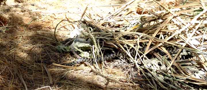 Below, the tail portions are highlighted as the same snake disappears into a tangle of dead grasses. Click on the image for a close-up view.