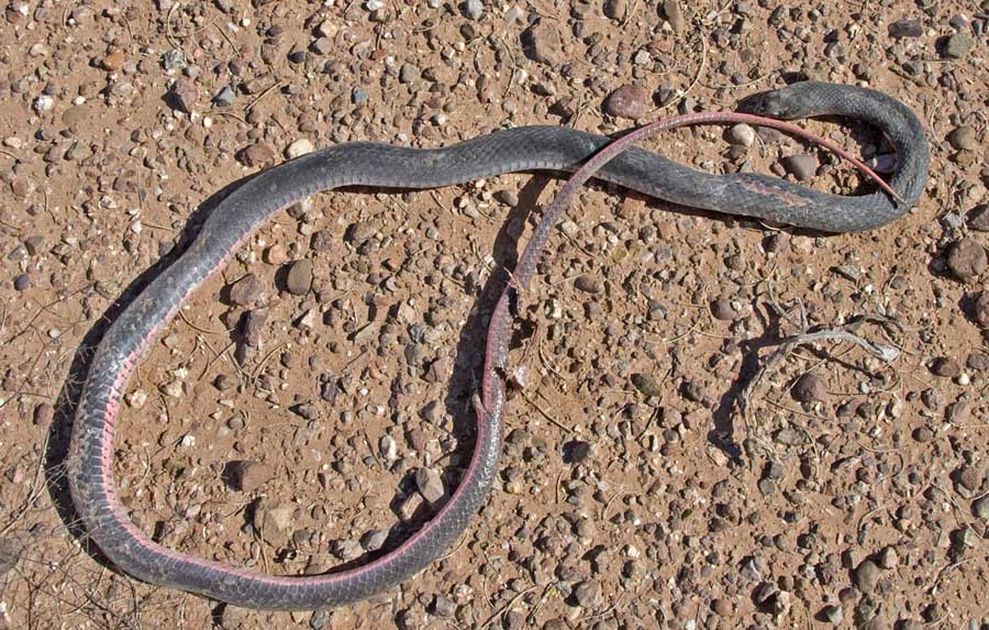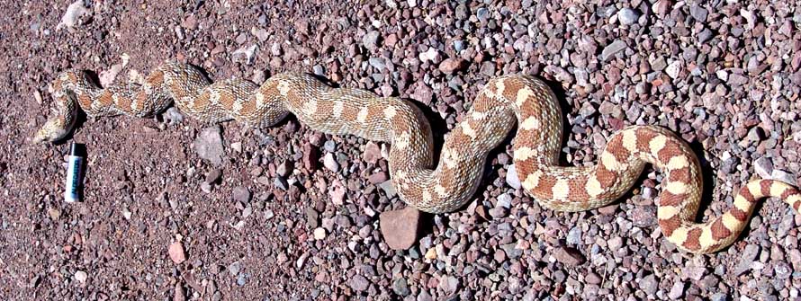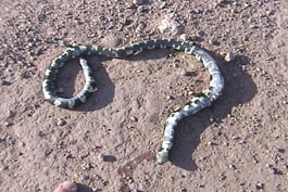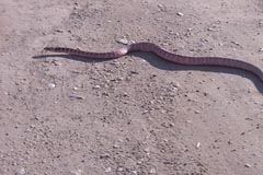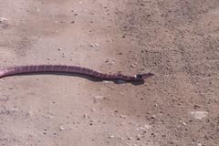 This one (in the photos above and below) was seen as a roadkill on Cascabel Road near Teran Wash, September 2000. Its length was 16-20". Above left shows its belly, above right its appearance from above. Click on right-hand image to enlarge.