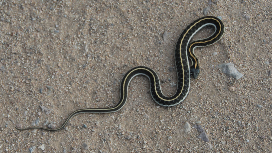 On August 31, 2008, we were driving along Cascabel Road near Milepost 16 when we saw a pair of vultures standing in the middle of the road. As our vehicle approached, they flew off, and we drove slowly up right beside this small Black-necked Garter Snake, which remained motionless in the roadway gravel. Thinking it might be dead, we got out of the vehicle (it was 5:38 pm) and took the following photograph below: Click on the image to enlarge it