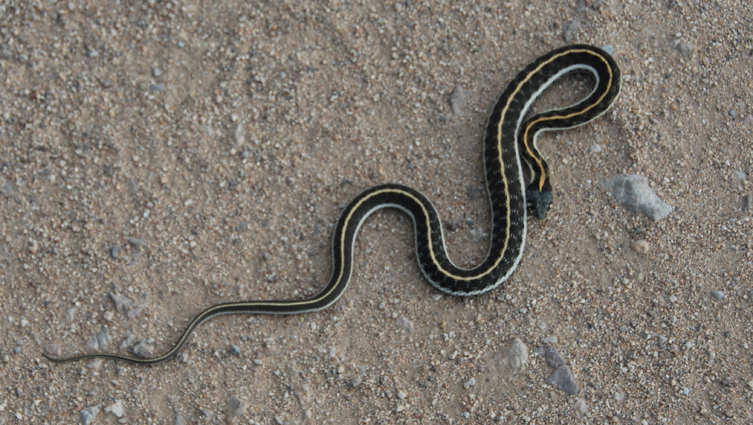 Unlike the rare Mexican Garter Snake, Checkered Garter Snakes are common in our area. Matt Goode says, "They look an awful lot like checkered garter snakes, but one of the best ways to tell them apart is the cream-colored line on the side of the body covers scale rows 3 and 4, whereas it only covers scale row 3 on a checkered garter snake. Examining the frozen corpse closely under magnification, we could see that the line does cover only one scale. Also, checkered garter snakes have a lot more blotches or checks than Mexican garter snakes."