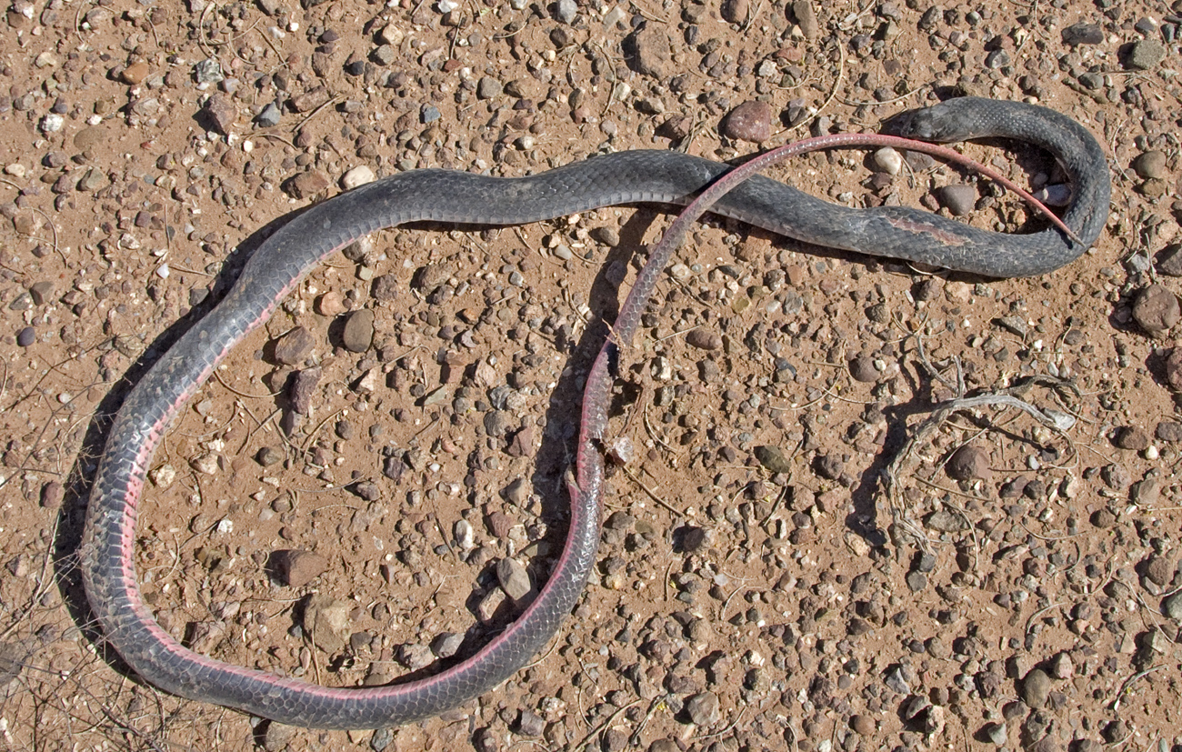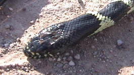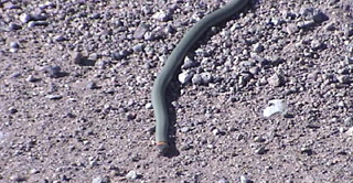 The above pictures of the Ringneck Snake are not very good, but they do provide the main indicators of the species: blue-olive in color, with a dark head and conspicuous orange neck-band; its belly is red (brighter where closer to the tail), and its scales very smooth. When faced with an intruder, it may curl its head and upper body up quite high, revealing its startlingly bright underparts. Ringnecks prefer moist environments (particularly forests), and are seldom seen in the open (though we encountered one crossing the wash below the Trail Tank on the Pool Wash ridge road during the rainy season). This one above was crossing the Cascabel Road near mile 19 one fine October day. (We will have better images when we begin inserting video movies rather than stop-action, which these shots are.)