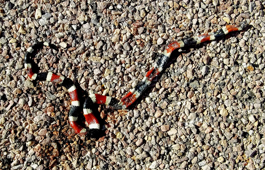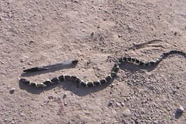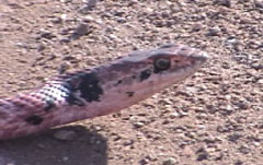 This Kingsnake (below) was killed by a predator (probably a raptor) and found on the ground at the mouth of Sierra Blanca Spring Wash one afternoon in October 2005. It was very recently dead (probably the same day -- it had not been seen earlier in the day at this location). Its spine had been broken in at least one place, and it had been lacerated in several, but nonetheless the corpse had been abandoned. Perhaps the raptor had struggled with it at this location, then abandoned it to die. Click on the image to enlarge it.