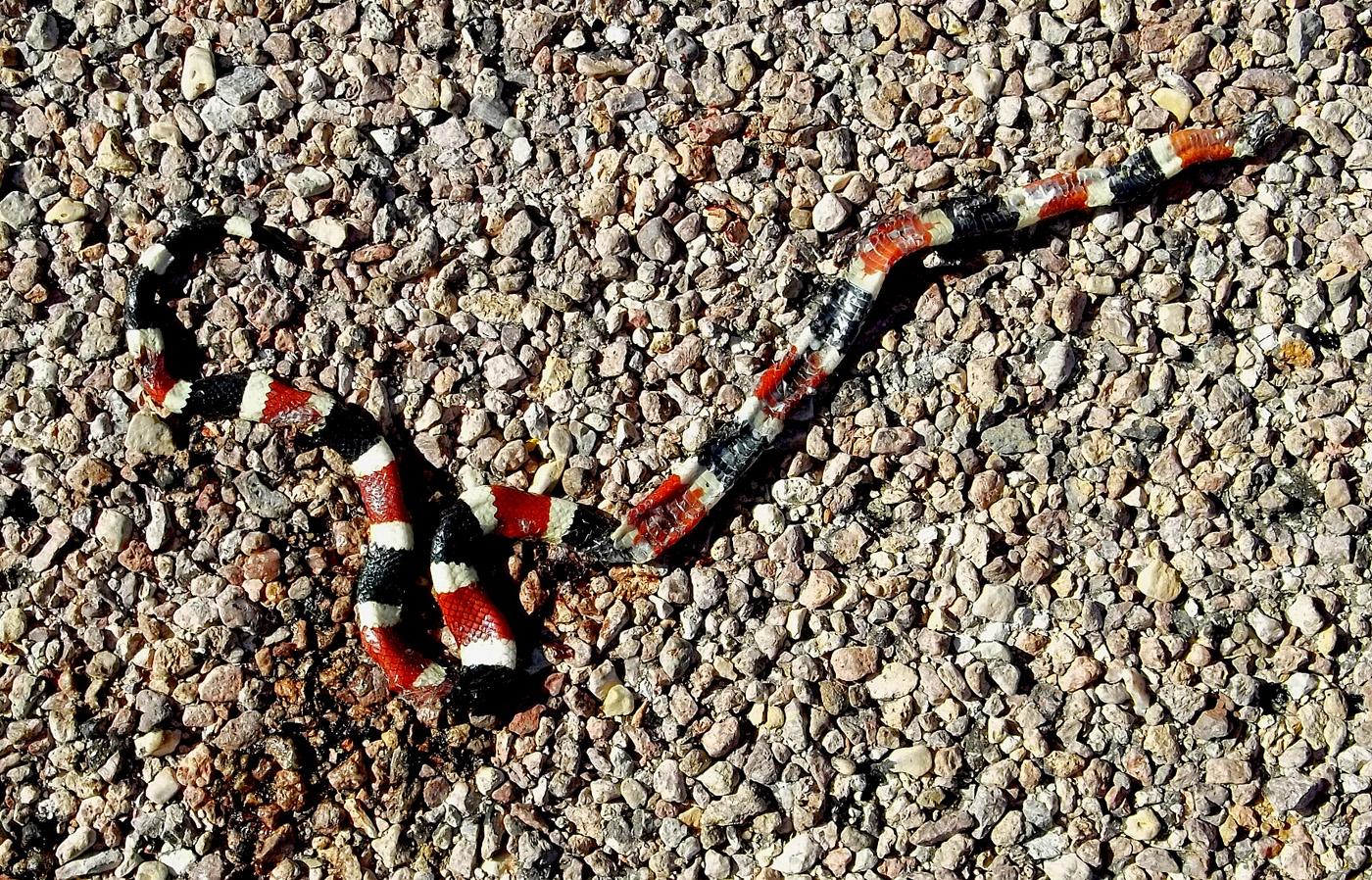 These snakes are widely distributed through southeastern Arizona to the Mogollon Rim. Stebbins 2003, p. 405, says "In Ariz., most abundant in rocky upland desert, especially along arroyos and river bottoms." Since making this entry, we asked our Saguaro Juniper Associates living along or near the San Pedro River in Cascabel to report sitings, and have received half a dozen replies, mostly of a single sighting. All have been seen fairly close to water, including two in Hot Springs Canyon. David Omick and Pearl Mast, who lived in a remote site near the HSC Windmill for 8 years, saw one just once. Barbara Clark, who has lived by the River near Teran Wash for 40 years, reports a sighting about once every ten years. Our sense from these accounts is that Coral Snakes are fairly plentiful in our area, but are rarely seen because they are what Stebbins calls "A secretive species, abroad chiefly at night but sometimes encountered in daytime on overcast days or after rains. Spends much time underground." (Ibid.)