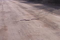 The Coachwhip shown above (Cascabel Road, about Mile 19) first appeared to be dead by virtue of its odd position and its lack of movement (on the left). But the date was January 2001, and its sluggishness was no doubt associated with the day's low temperature. After the second photograph (middle left), it suddenly sprang into slow but steady motion, finishing its road crossing just as a large back-hoe vehicle lumbered by.