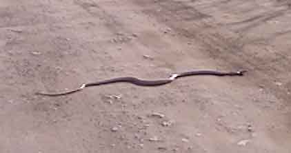 Satisfied with our imagery, we then moved to prod the snake with a stick, and it ran off in a flash under the vehicle, quickly dashed off the roadway up the gravel siding and disappeared in the adjacent shrubbery. We thought the vultures must have earlier "cornered" it in a sense, standing on each side of it, and were preparing to peck at it when we arrived. As we drove off they glared at us in silence from the roadside some 40 yards further on.