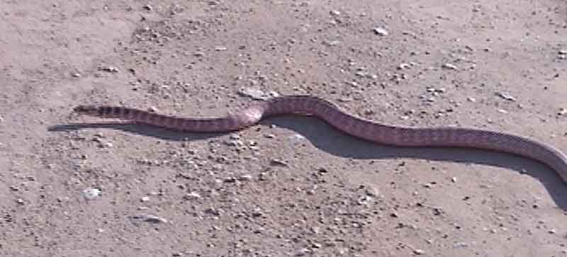 Below, our April 2007 gopher may have ventured out somewhat early in the season, a cool day. We encountered it just past midday, but it was loath to move, though it sampled the air with its tongue sporadically, thus showing life. It only moved on well after the photographer departed. We estimated this one at about 4 feet long.