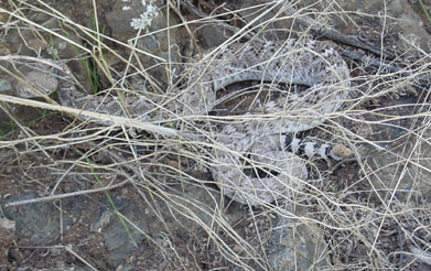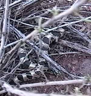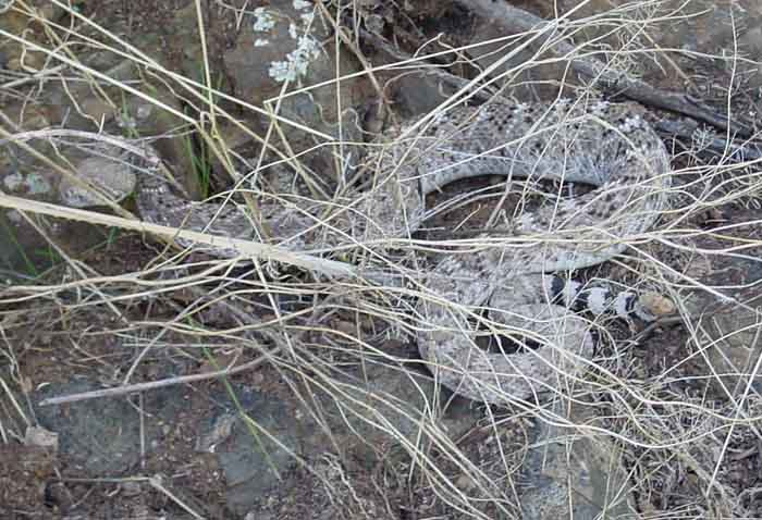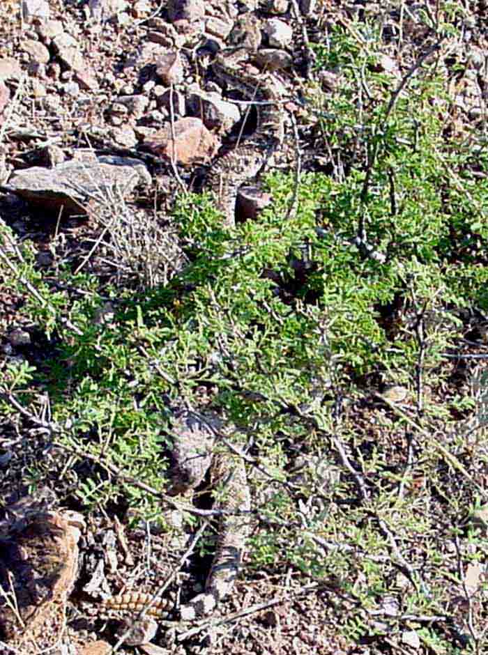 Below left: encountered along the trail near the saddle of Sierra Blanca Spring trail. This one was very difficult to see (as the image reflects; the head is at top center) -- it was heard from close up or would not have been detected. Below right: seen in the Trail Tank wash. This one was crossing the open wash, so clearly visible, but again when under vegetation is well disguised, except for the distinctive black-white-banded tail above the rattle. Note too that the black/white banding is very marked, and that the black and white bands are roughly equal in width. This latter distinguishes the Western Diamondback from the Mohave Rattlesnake, which also displays some tail banding. See further below.