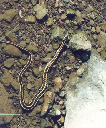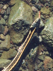 The distinguishing feature of this garter snake is the two large black blotches at the back of the head, separated by its whitish-to-pale-yellow mid-dorsal stripe. Mainly found in streams near foothills and mountains. It also occupies desert and grassland, and in wet weather it may wander far from water. Mainly diurnal, it eats frogs, toads, tadpoles, crustaceans. This one was found in the Hot Springs Canyon Stream in July of 1995, and photographed by Mark Apel.
