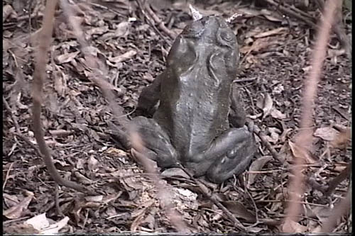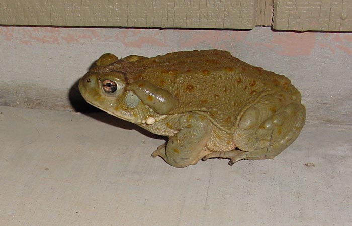 Here is an interesting contrast: on the left below, a well-fed Sonoran Toad at the height of the San Pedro Valley Monsoon, seen gobbling insects near illuminated windows at the Cascabel airport in late July 2003, and on the right, a hibernating Sonoran which had been accidentally brought to the surface by a roto-tiller working Bentonite into the Big Tank in November 1999. Note the difference in body tone in the two animals. Click on the image at left to enlarge. In both of these photos, note the enlarged whitish wart near the angle of the jaw (also an identifying feature), and note also the conspicuous grayish eardrum in the left-hand photos.