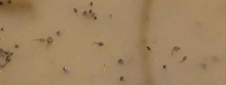 Toads epitomize the condition of the "Amphibians", in other words they lead a "double life": they must first lay their soft eggs in water, the eggs are then fertilized by the male who releases sperm over them. The embryos then swim in water like fish, legless, propelling themselves by their tails and breathing through fish-like gills, before they metamorphose into tetrapods, losing their gills, developing legs and lungs. Below, what are probably a variety of toad (and frog) tadpoles, occupying a gradually declining side pool left from San Pedro River floods near Cascabel in August of 2004: