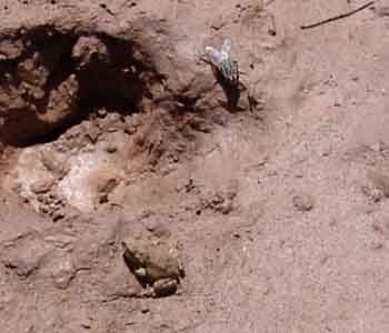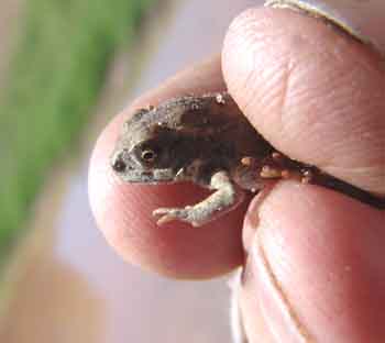 We have done little in the way of photographing or distinguishing the toads on our Saguaro Juniper lands. This page is merely a beginning, like the lives of these youngsters encountered in one of our watertanks. Below left, a very small toad shares part of a mud flat with a creature of similar size -- a House Fly -- in the Big Tank, August 2004; at right, the same toad held up for its portrait. Click on each image to enlarge it.