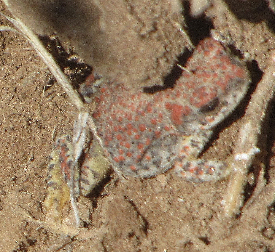 This toad, whose base color runs from pale gray to tan, typically has numerous small red tubercles scattered around the back of its body. It is distinguished from the Mexican Spadefoot (also red-spotted and found in our area) by its lack of the spadefoot, by the flatness of its head (the Spadefoot’s is rounder), and its visible paratoid glands behind the eyes, not clearly evident in this low-resolution image. Click on image to enlarge.