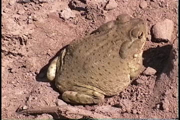This small animal may well be the direct descendant of the one shown far below, at right -- an example of the Sonoran Desert Toad (Bufo alvarius), shown below feasting upon a fully grown Woodhouse Toad (Bufo woodhousei). Only the two hind limbs of the Woodhouse Toad are visible as it disappears into the larger toad's maw. Click on the image for a close-up.