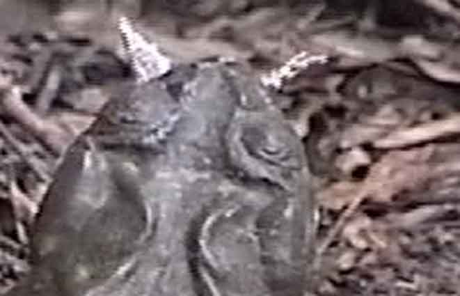 The large warts on the hind legs, contrasting with the smooth leg skin, are identifying features of this toad.