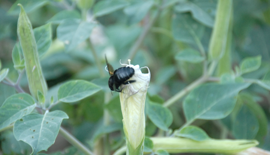 Below, a Carpenter Bee on a budding Datura flower, photographed on the floodplain of the Middle San Pedro River, September 1, 2008: